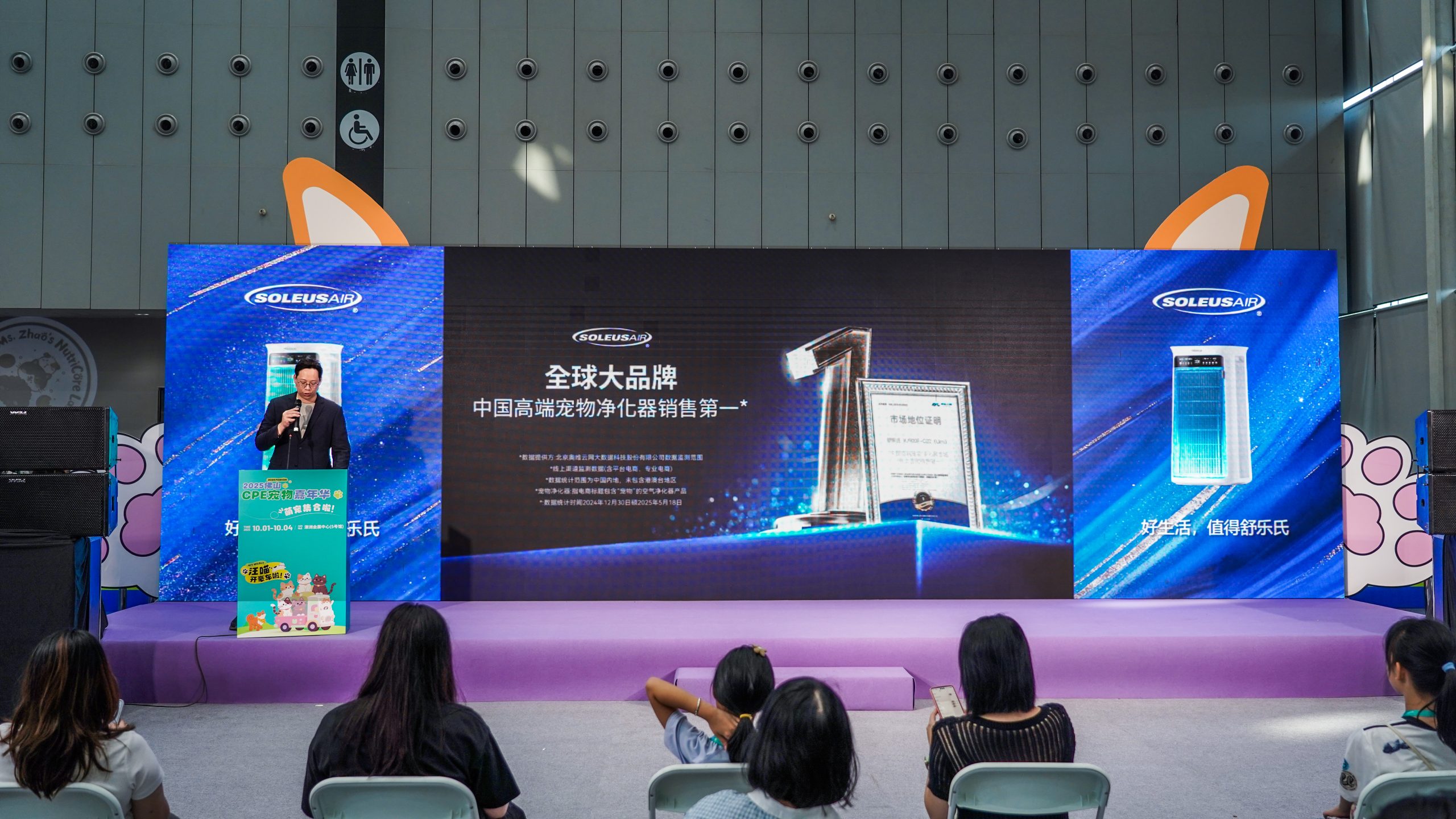 在展会同期举办的宠物行业发展论坛上,SoleusAir舒乐氏高级产品经理受邀上台演讲,并详细介绍了舒乐氏品牌理念,以及宠物线产品矩阵:包括获得【高端宠物净化器市场销售第一】的舒乐氏umi宠物净化器,和另一款舒乐氏宠物净化器C01。