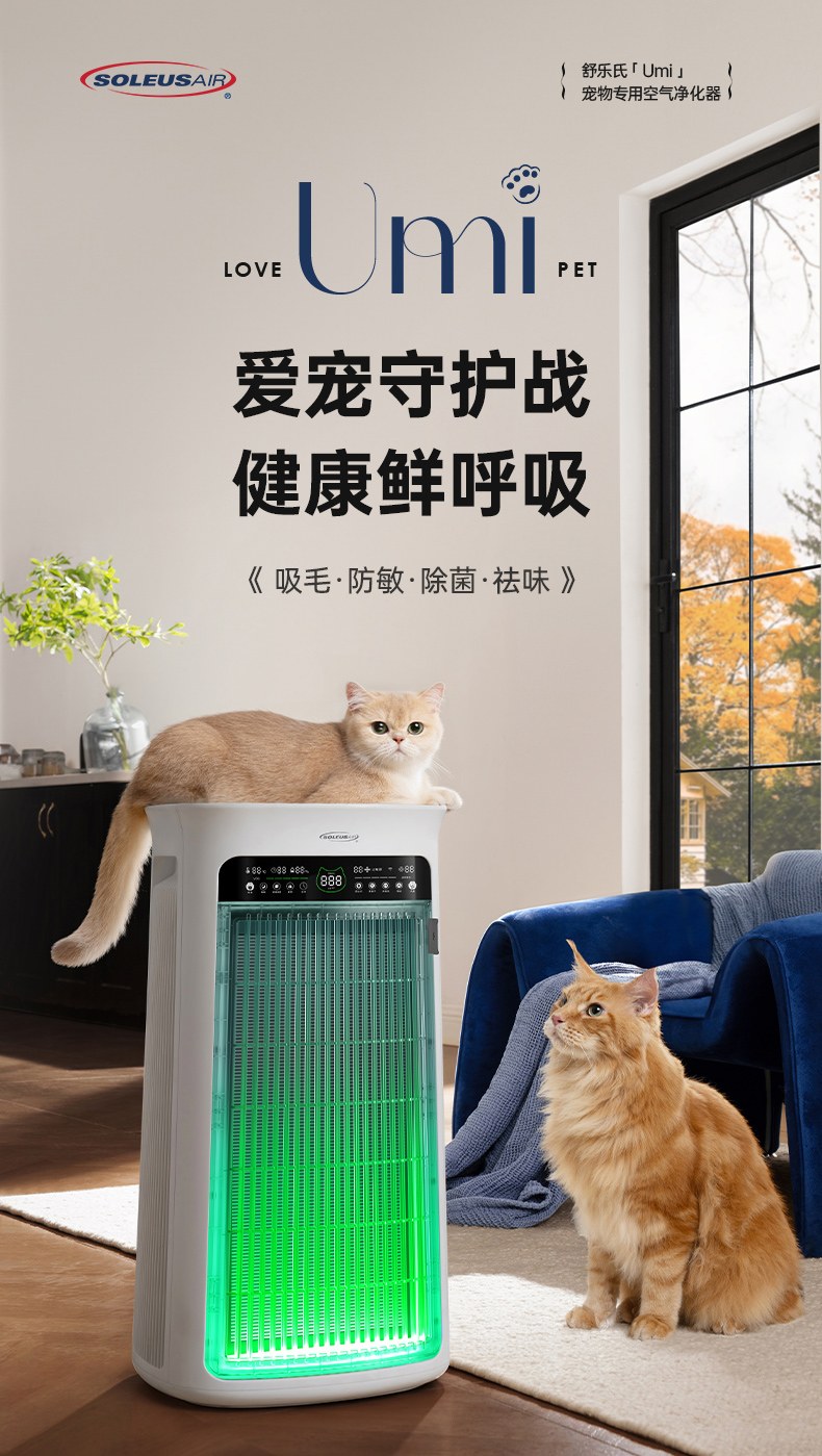 自1997年创立以来,SoleusAir舒乐氏始终深耕环境健康家电领域,围绕养宠家庭不同场景的空气净化需求,舒乐氏构建了覆盖全场景的宠物净化产品矩阵,本次展出的Umi宠物净化器、宠物净化器C01、空气净化器G20三大明星产品,凭借差异化的功能优势,精准匹配不同养宠家庭的核心诉求,成为展会期间的“人气单品”。