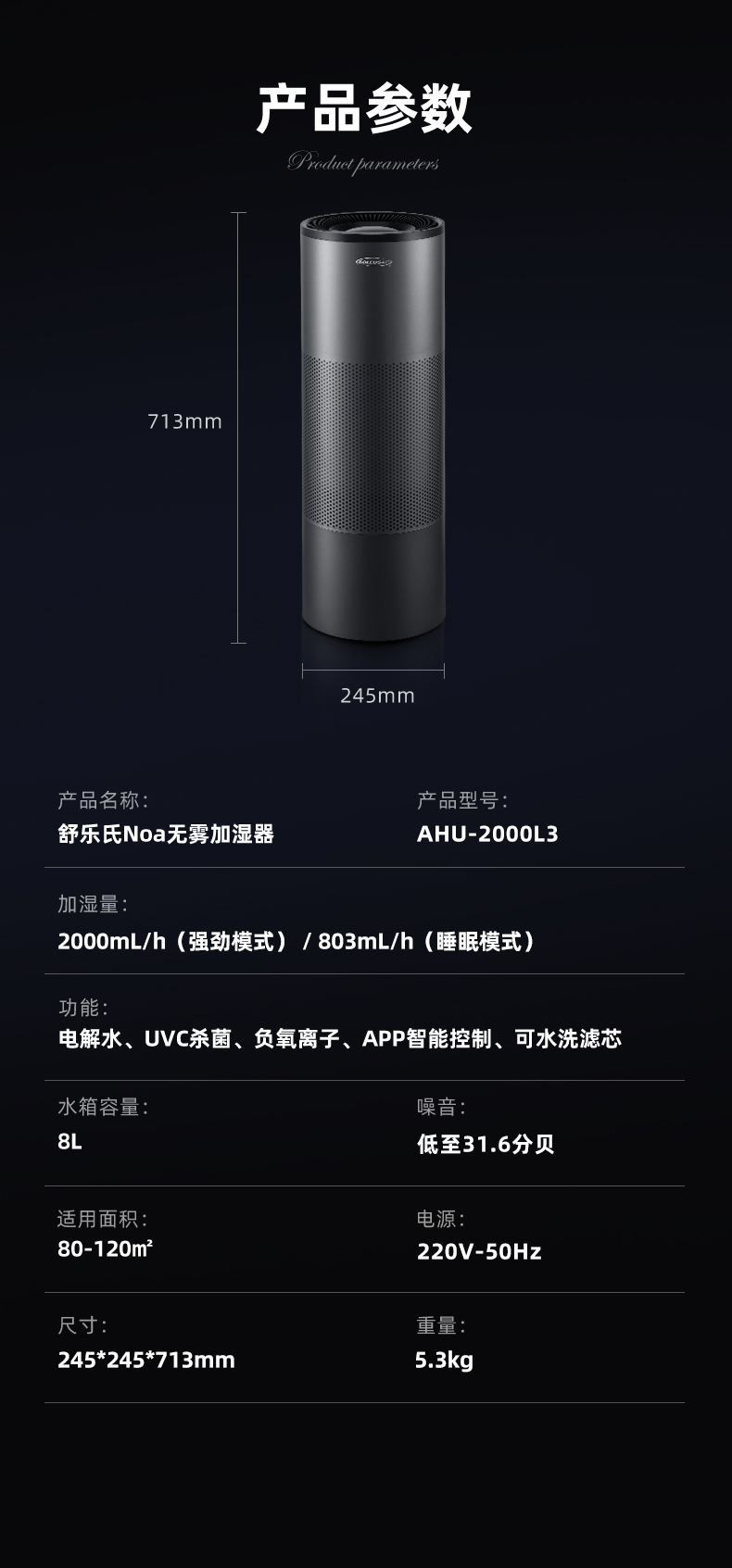 产品介绍 产品参数 AHU-2000L3 舒乐氏Noa无雾加湿器 无雾加湿,7重除菌 品牌: SOLEUSAIR 零售价: 1699 货号: AHU-2000L3 产地: 中国大陆 适用面积: / 特色功能: 无雾加湿,7重除菌 最大功率: 20W 产品净重: / 额定电压: 220V 产品尺寸: 245*245*713 运行噪音: 31.6db 产品颜色: 白色 售后保障: 七天无理由 上市日期: 2025年 立即购买 产品介绍